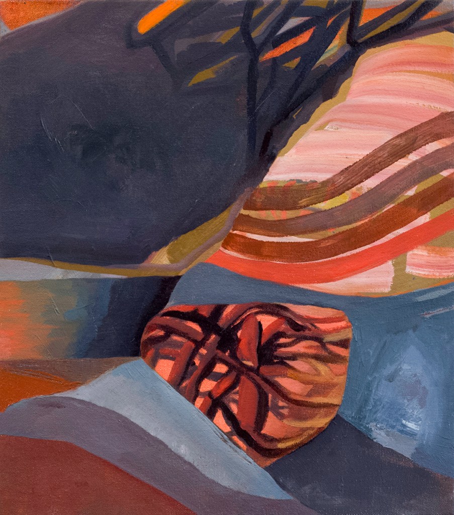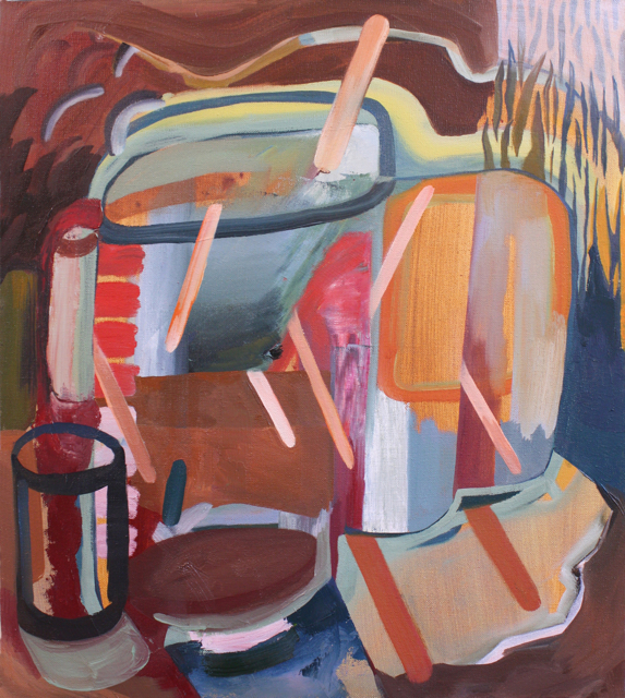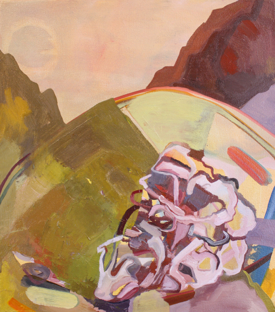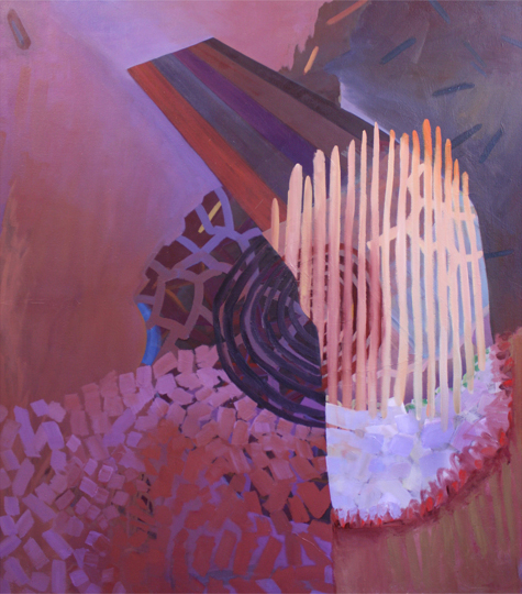 The paintings in this body of work reveal unexpected territories. It is a sense of discovery offset with the informal which the artist explores. In service of that exploration, forms that loosely resemble rocks, trees, windows, or other aggregations are partnered with otherworldly portals and abrupt brushwork. This partnership creates a tense specificity, charging the paintings with both humor and a sense of trespass. Sudden contrasts between deep and flat space, dynamic and static forms, vibrant and neutral colors, all serve the original exploration. Additionally, while the forms are nonfigurative, they are often imbued with a character that suggests life, habitation, activity or motion.
